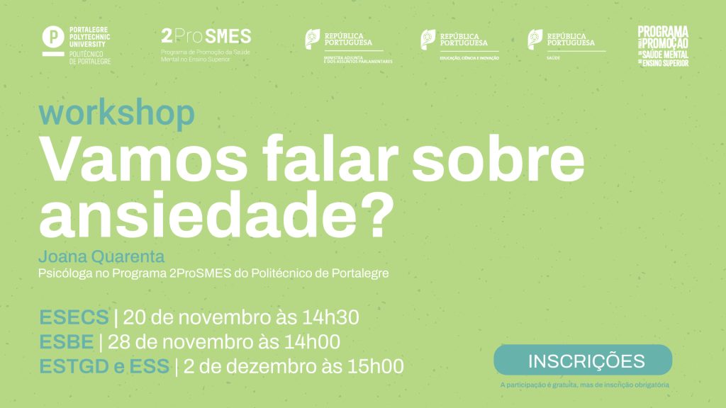 O Programa 2ProSMES – Programa de Promoção da saúde Mental no Ensino Superior do Politécnico de Portalegre – vai promover o Workshop “Workshop “Vamos falar sobre ansiedade?””