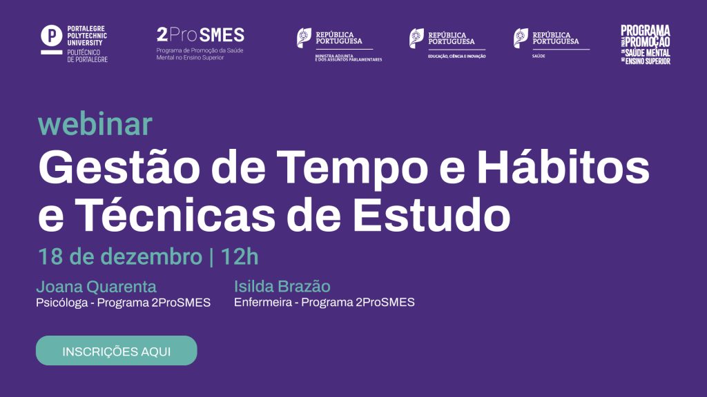 O Programa 2ProSMES – Programa de Promoção da saúde Mental no Ensino Superior do Politécnico de Portalegre – vai promover o Webinar “Gestão de Tempo e Hábitos e Técnicas de Estudo”