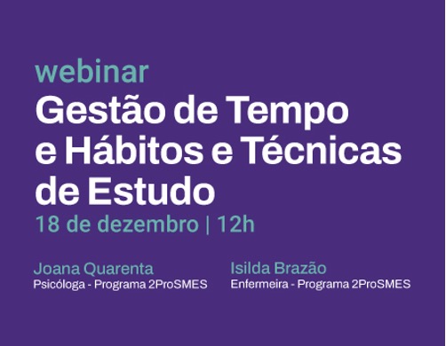 No dia 18 de dezembro, realizou-se o webinar “Gestão de tempo, técnicas e hábitos de estudo”. Este webinar teve como principais objetivos capacitar os estudantes para aplicar estratégias de gestão de tempo e aprender métodos e técnicas de estudo que contribuam para a regulação dos níveis de stress e de ansiedade próprios da época de avaliações.